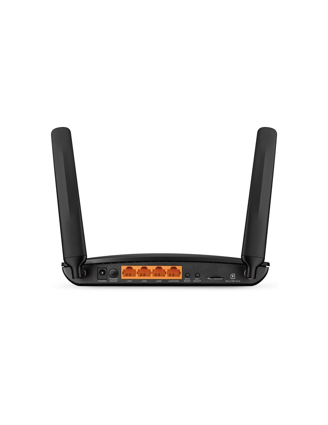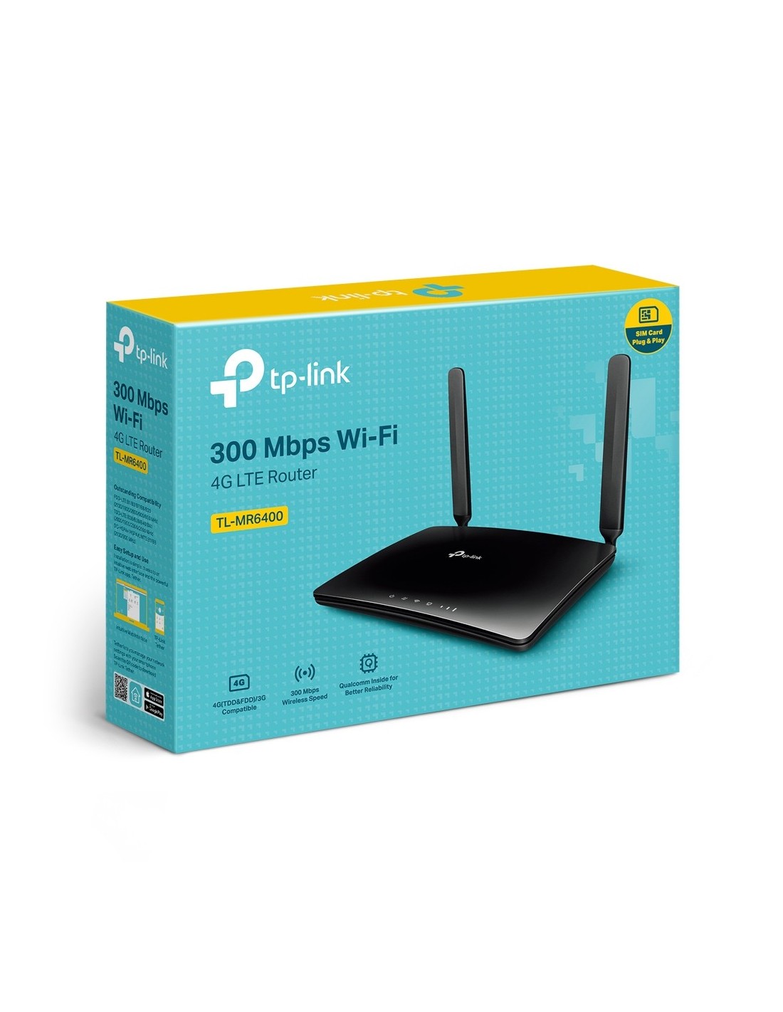 TP-Link TL-MR6400. Tipo de conexión WAN: RJ-45. Banda Wi-Fi: Banda única (2,4 GHz), Estándar Wi-Fi: Wi-Fi 4 (802.11n), Tasa de transferencia de datos WLAN (máx.): 300 Mbit/s. Tipo de interfaz Ethernet LAN: Ethernet rápido, Ethernet LAN, velocidad de transferencia de datos: 10,100 Mbit/s, Tecnología de cableado: 10/100Base-T(X). Generación de red móvil: 4G, Estándares 3G: HSPA+, UMTS, Estándar 4G: LTE. Algoritmos de seguridad soportados: 64-bit WEP, 128-bit WEP, WPA, WPA-PSK, WPA2, WPA2-PSK