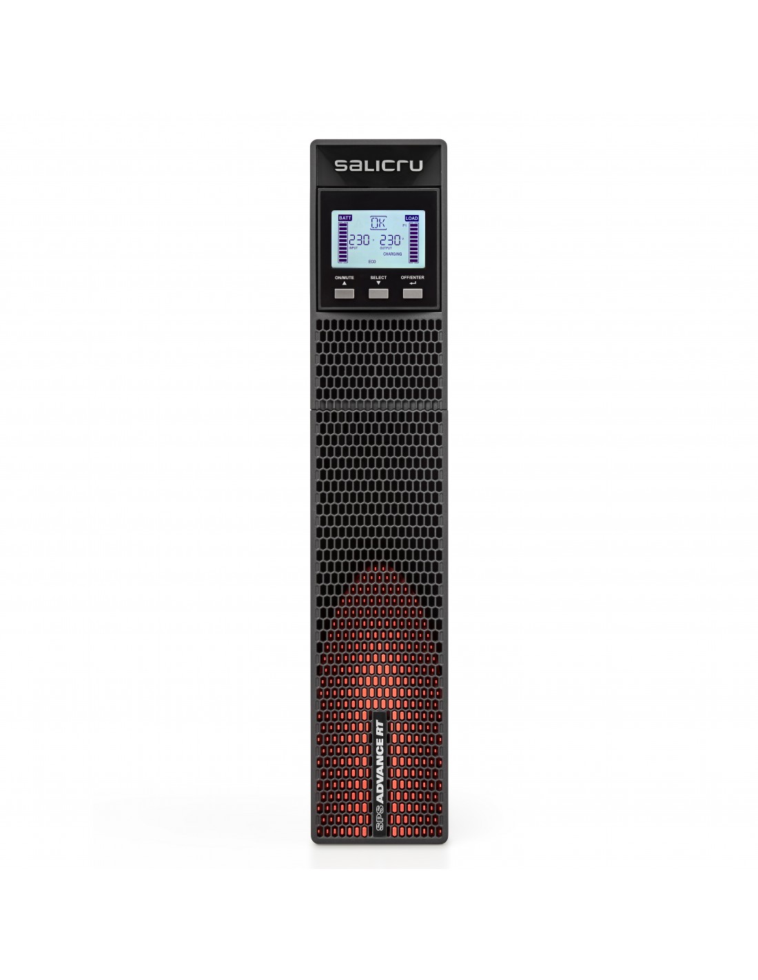 Salicru SPS 3000 ADV RT2. Topología UPS: Línea interactiva, Capacidad de potencia de salida (VA): 3 kVA, Potencia de salida: 2700 W. Tipo de salida AC: C13 acoplador, C19 acoplador, Conector: C20 acoplador, Cantidad de salidas AC: 9 salidas AC. Tecnología de batería: Plomo-Calcio (Pb-Ca), Tiempo de recarga (90%): 4 h, Tipo de carga: Corriente constante/Tensión constante. Factor de forma: Montaje en rack/Torre o Montaje en bastidor/Torre, Color del producto: Negro, Capacidad del rack: 2U. Ancho: 438 mm, Profundidad: 630 mm, Altura: 88 mm