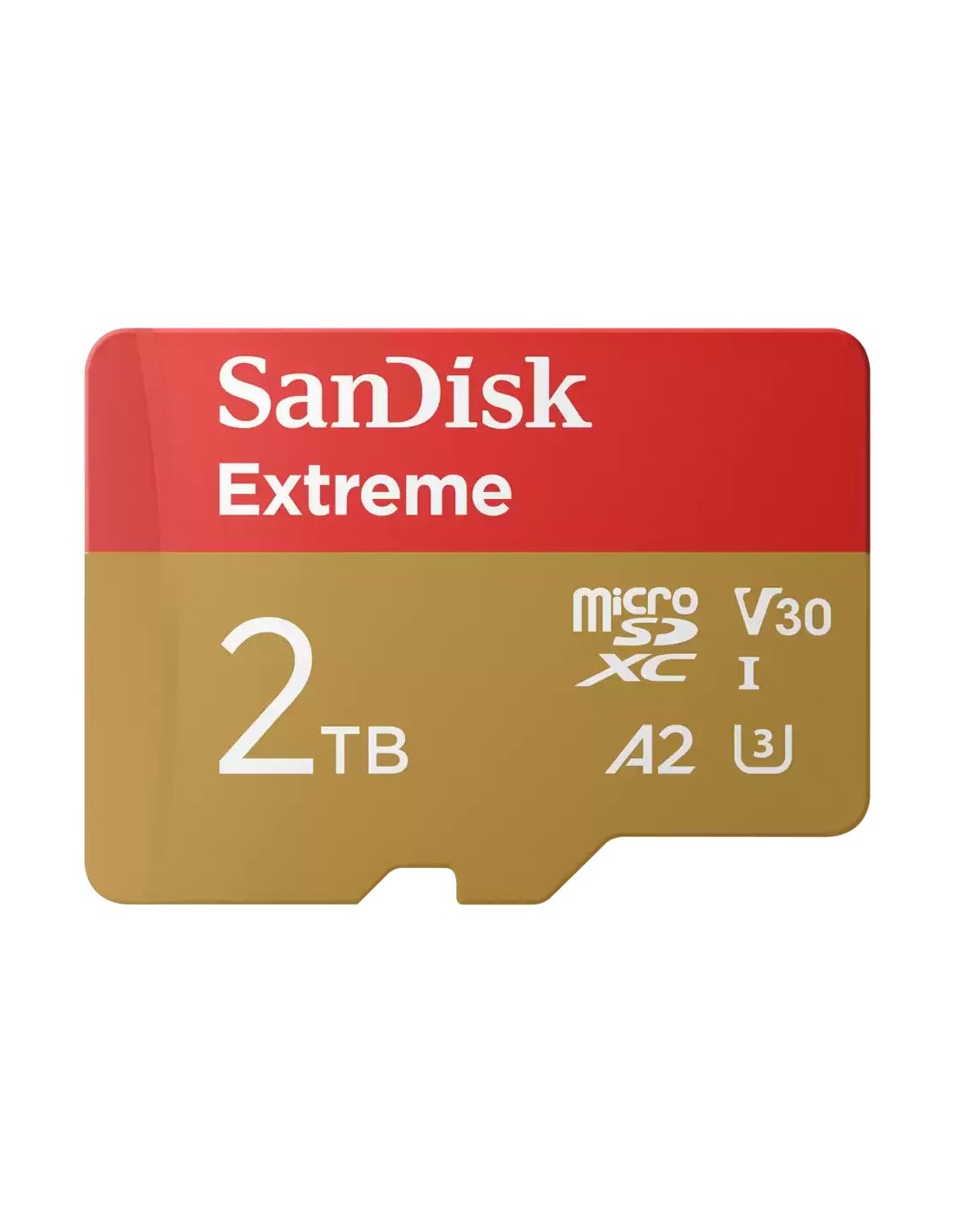SanDisk Extreme. Capacidad: 2 TB, Tipo de tarjeta flash: MicroSDXC, Clase de memoria flash: Clase 10, Tipo de memoria interna: UHS-I, Velocidad de lectura: 240 MB/s, Velocidad de escritura: 140 MB/s, Clase de velocidad UHS: Class 3 (U3), Clase de velocidad de vídeo: V30. Funciones de protección: Protección contra caídas, Protección contra campos magnéticos, Resistente a golpes, Resistente..., Color del producto: Oro, Rojo
