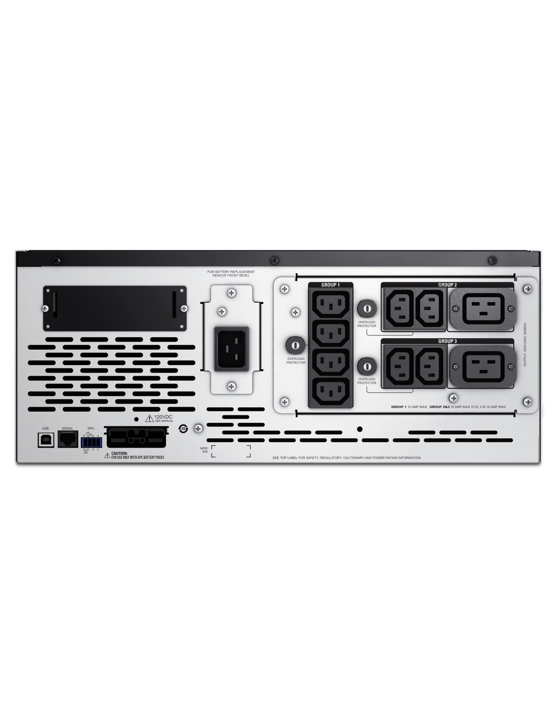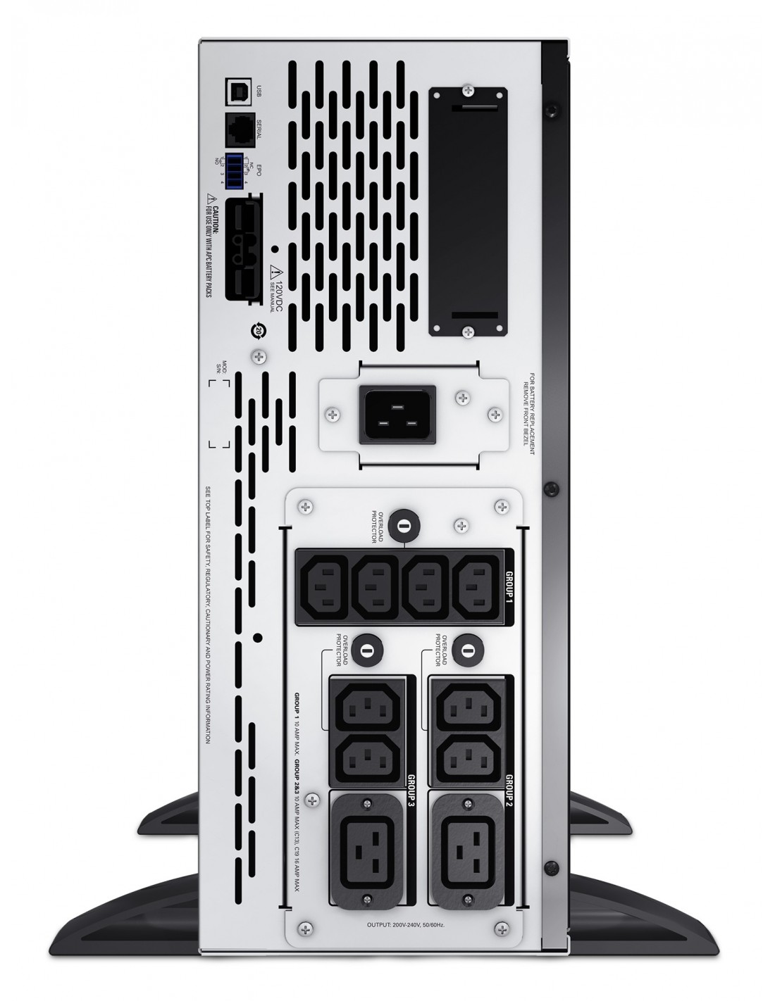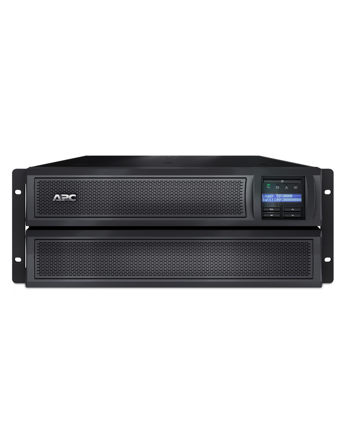 APC Smart-UPS. Topología UPS: Línea interactiva, Capacidad de potencia de salida (VA): 3 kVA, Potencia de salida: 2700 W. Tipo de salida AC: C13 acoplador, C19 acoplador, Conector: C20 acoplador, Cantidad de salidas AC: 10 salidas AC. Tecnología de batería: Sealed Lead Acid (VRLA), Capacidad de la batería: 738 VAh, Tiempo típico de respaldo a carga completa: 6,3 min. Factor de forma: Montaje en rack/Torre o Montaje en bastidor/Torre, Color del producto: Negro, Acero inoxidable, Capacidad del rack: 4U. Ancho: 178 mm, Profundidad: 483 mm, Altura: 432 mm