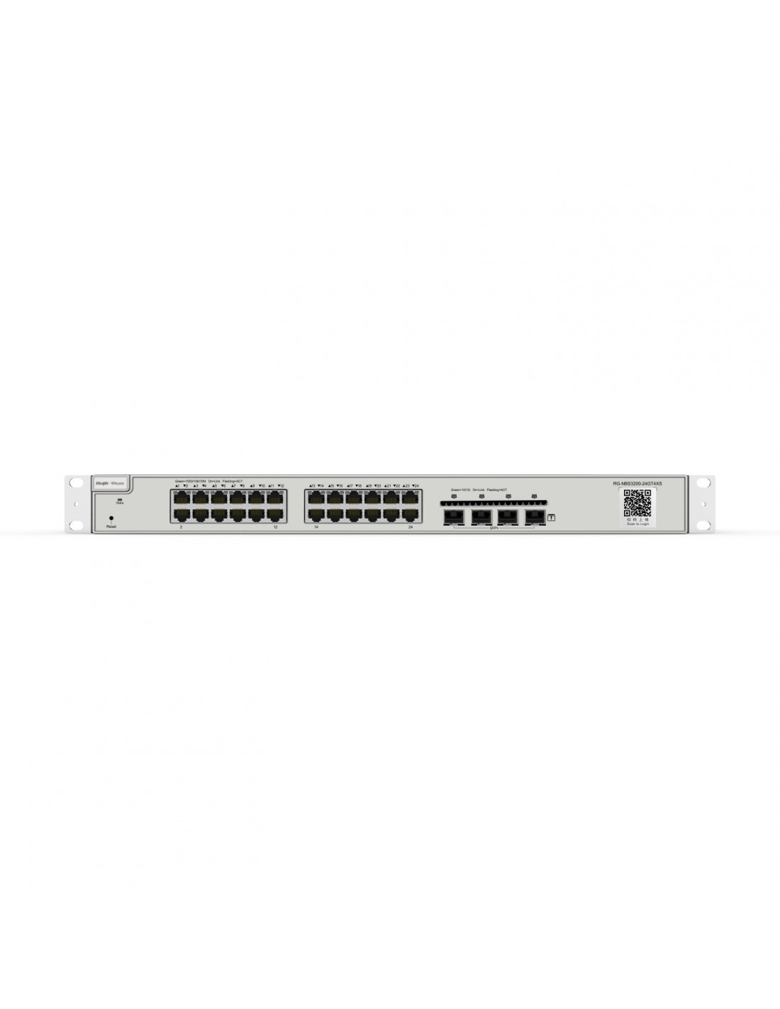 Ruijie Networks RG-NBS3200-24GT4XS. Tipo de interruptor: Gestionado, Capa del interruptor: L2. Puertos tipo básico de conmutación RJ-45 Ethernet: Gigabit Ethernet (10/100/1000), Cantidad de puertos básicos de conmutación RJ-45 Ethernet: 24. Tabla de direcciones MAC: 16000 entradas, Capacidad de conmutación: 128 Gbit/s. Estándares de red: IEEE 802.1x
