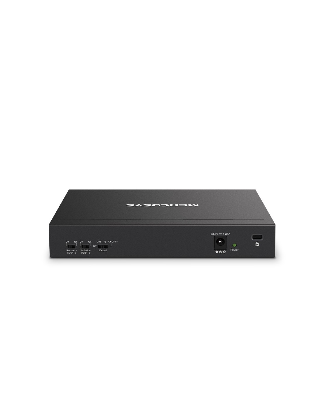 Mercusys MS110P. Tipo de interruptor: Gestionado. Puertos tipo básico de conmutación RJ-45 Ethernet: Fast Ethernet (10/100), Cantidad de puertos básicos de conmutación RJ-45 Ethernet: 10. Bidireccional completo (Full duplex). Tabla de direcciones MAC: 2000 entradas. Estándares de red: IEEE 802.3af, IEEE 802.3at, IEEE 802.3x. Voltaje de entrada DC: 53.5 V. Energía sobre Ethernet (PoE). Montaje de pared