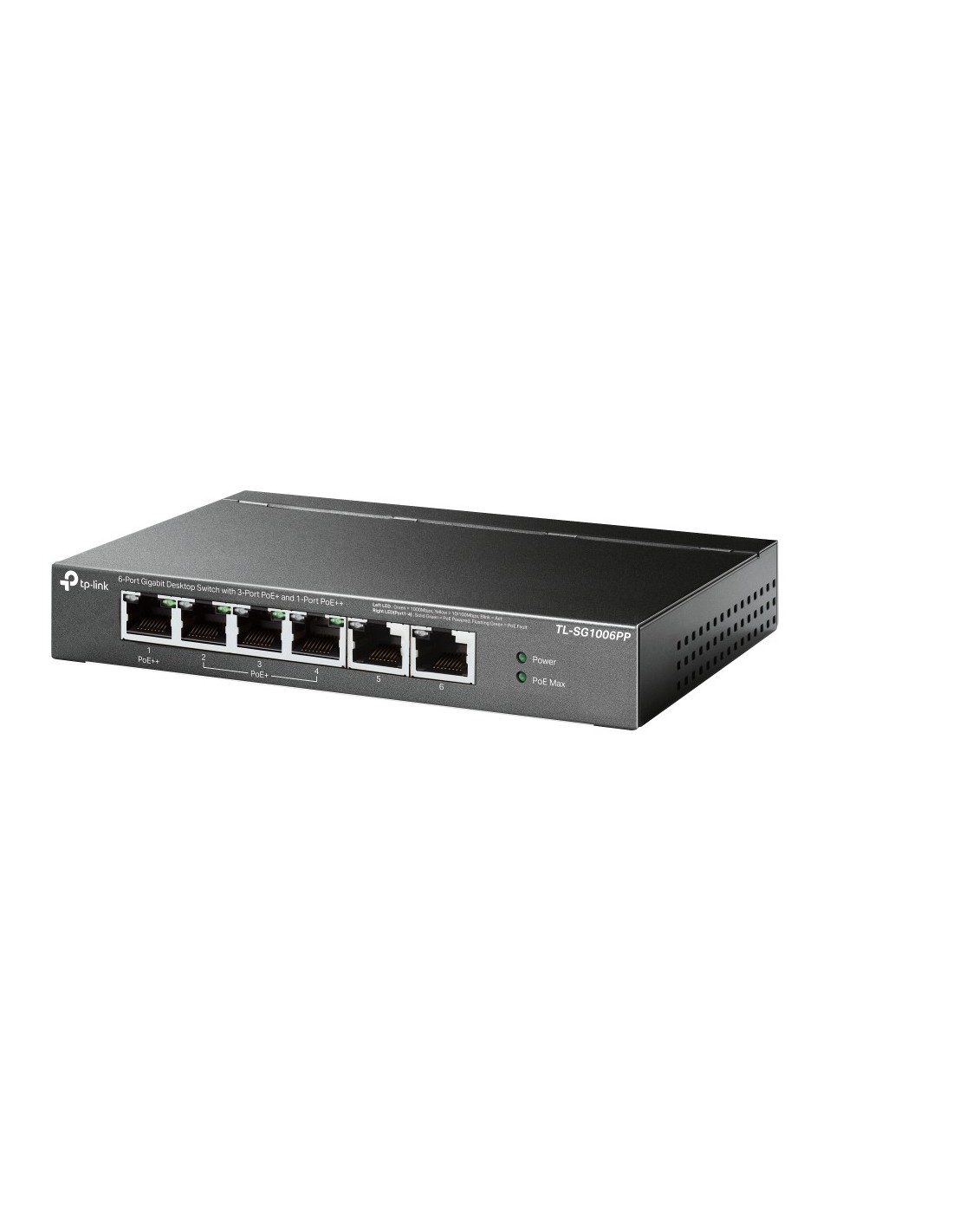 TP-Link TL-SG1006PP. Tipo de interruptor: No administrado. Puertos tipo básico de conmutación RJ-45 Ethernet: Gigabit Ethernet (10/100/1000), Cantidad de puertos básicos de conmutación RJ-45 Ethernet: 6. Tabla de direcciones MAC: 4000 entradas, Capacidad de conmutación: 12 Gbit/s. Estándares de red: IEEE 802.1p, IEEE 802.3af, IEEE 802.3at, IEEE 802.3bt, IEEE 802.3i, IEEE 802.3u, IEEE 802.3x. Voltaje de entrada DC: 53.5 V. Energía sobre Ethernet (PoE). Montaje en rack