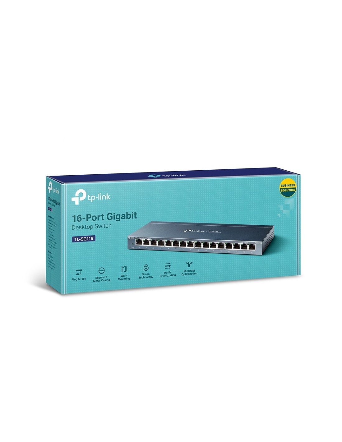TP-Link TL-SG116. Tipo de interruptor: No administrado. Puertos tipo básico de conmutación RJ-45 Ethernet: Gigabit Ethernet (10/100/1000), Cantidad de puertos básicos de conmutación RJ-45 Ethernet: 16. Bidireccional completo (Full duplex). Tabla de direcciones MAC: 8000 entradas, Capacidad de conmutación: 32 Gbit/s. Estándares de red: IEEE 802.1Q, IEEE 802.1p, IEEE 802.3, IEEE 802.3ab, IEEE 802.3u. Voltaje de entrada DC: 9 V. Montaje de pared