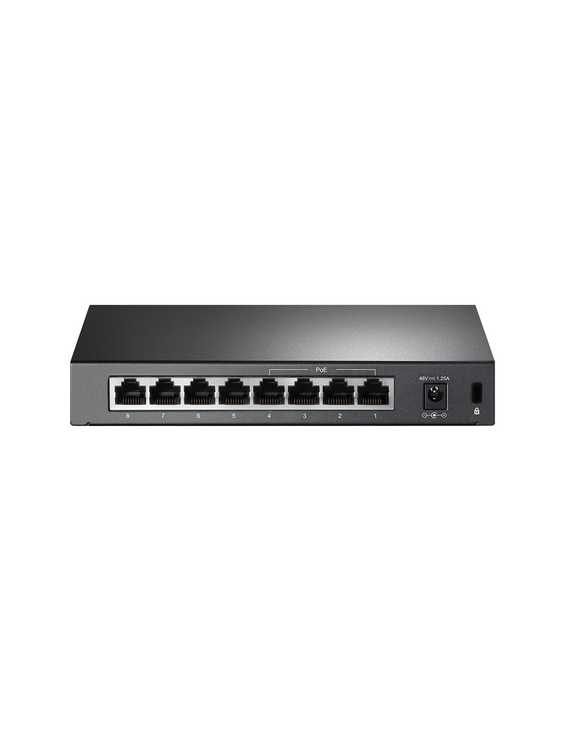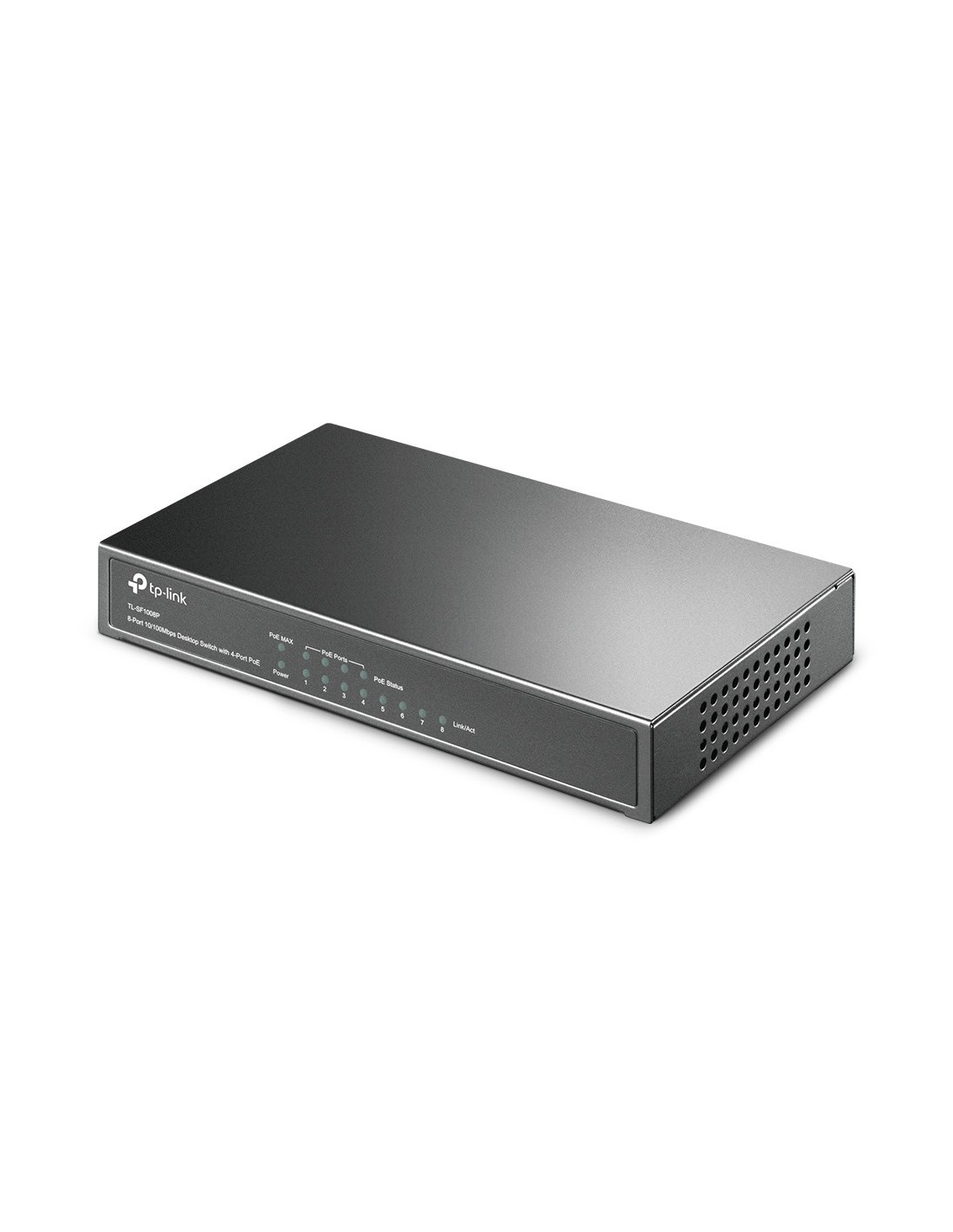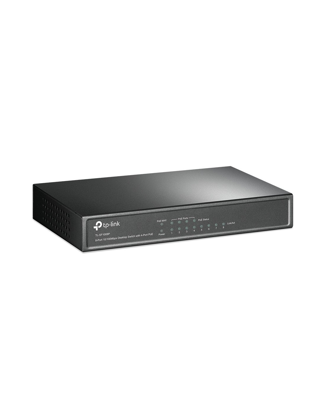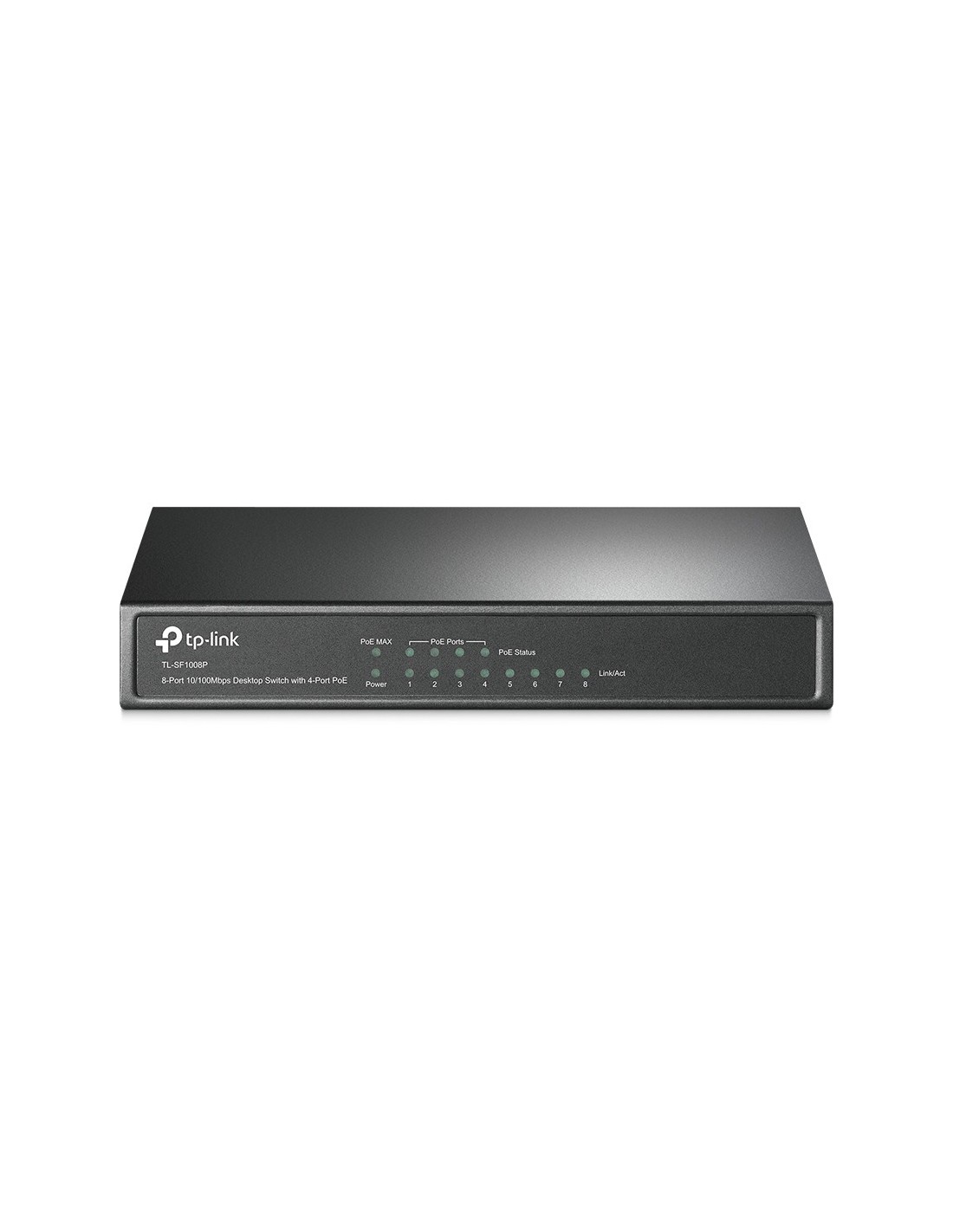 TP-Link TL-SF1008P. Tipo de interruptor: No administrado. Puertos tipo básico de conmutación RJ-45 Ethernet: Fast Ethernet (10/100), Cantidad de puertos básicos de conmutación RJ-45 Ethernet: 8. Bidireccional completo (Full duplex). Tabla de direcciones MAC: 2000 entradas, Capacidad de conmutación: 1,6 Gbit/s. Estándares de red: IEEE 802.1Qbb. Voltaje de entrada DC: 48 V. Conector eléctrico: Toma de entrada de CC. Energía sobre Ethernet (PoE)