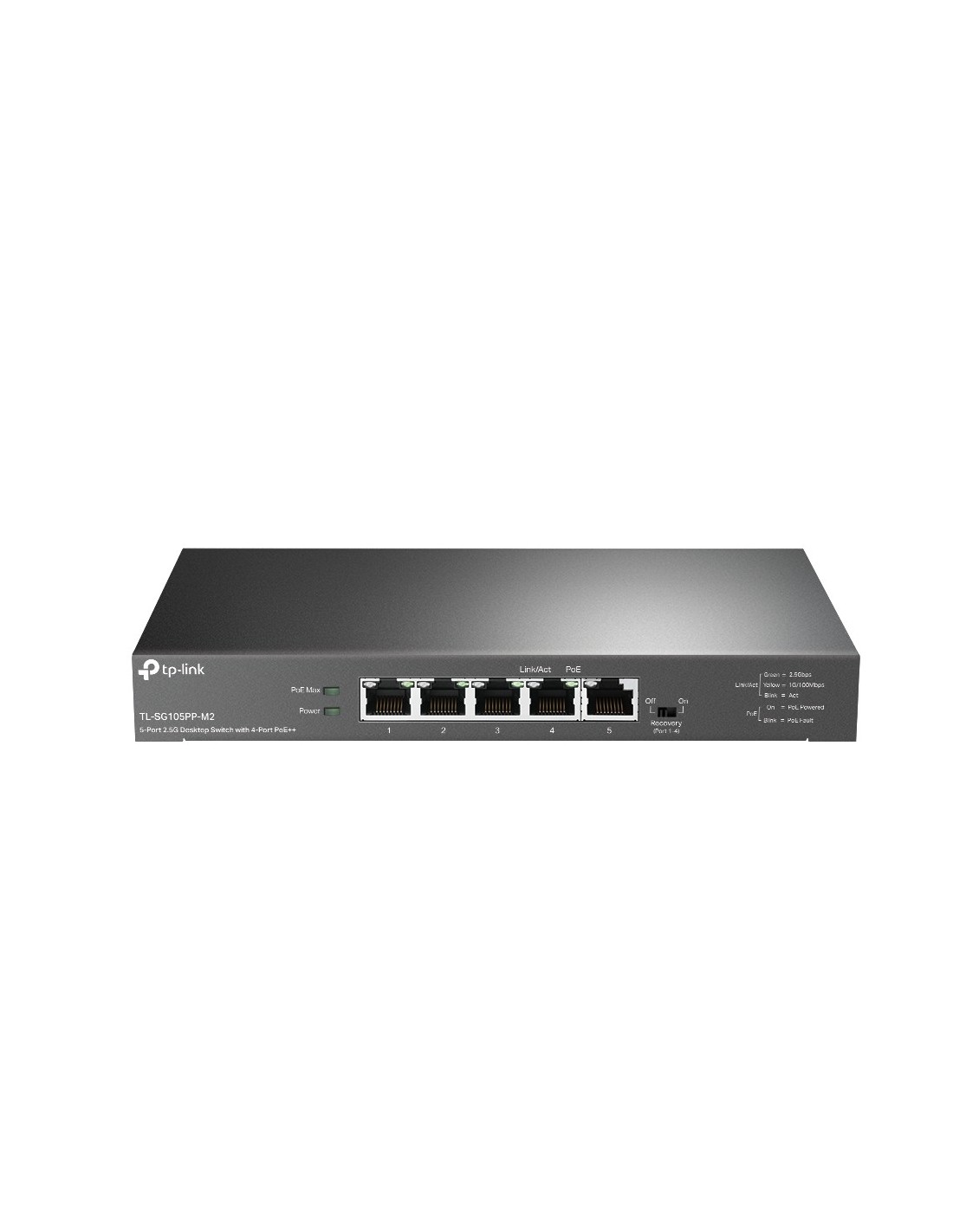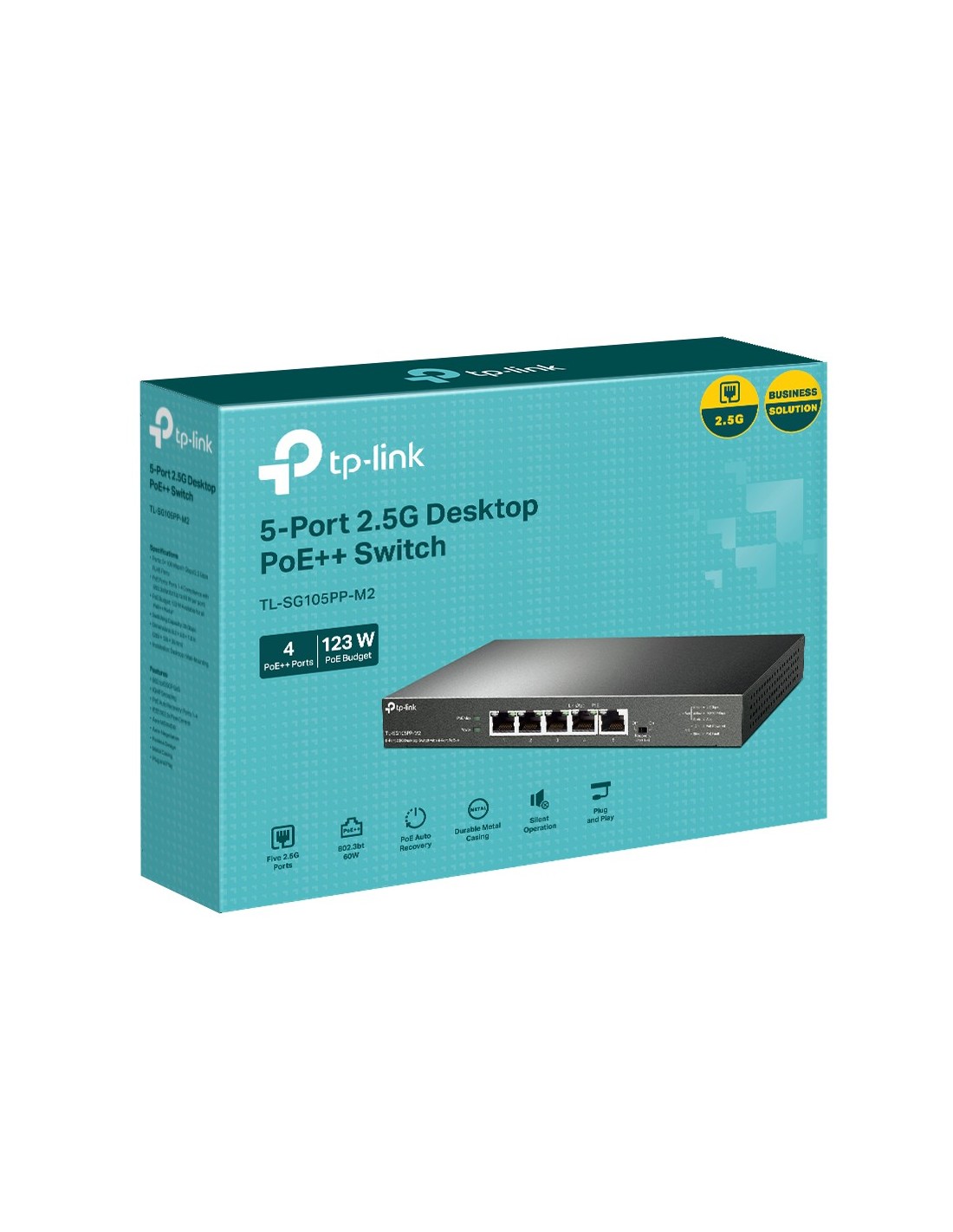 TP-Link TL-SG105PP-M2. Tipo de interruptor: No administrado. Puertos tipo básico de conmutación RJ-45 Ethernet: Gigabit Ethernet (10/100/1000), Cantidad de puertos básicos de conmutación RJ-45 Ethernet: 5. Bidireccional completo (Full duplex). Tabla de direcciones MAC: 4000 entradas, Capacidad de conmutación: 25 Gbit/s. Estándares de red: IEEE 802.1p, IEEE 802.3, IEEE 802.3ab, IEEE 802.3u, IEEE 802.3x. Montaje de pared