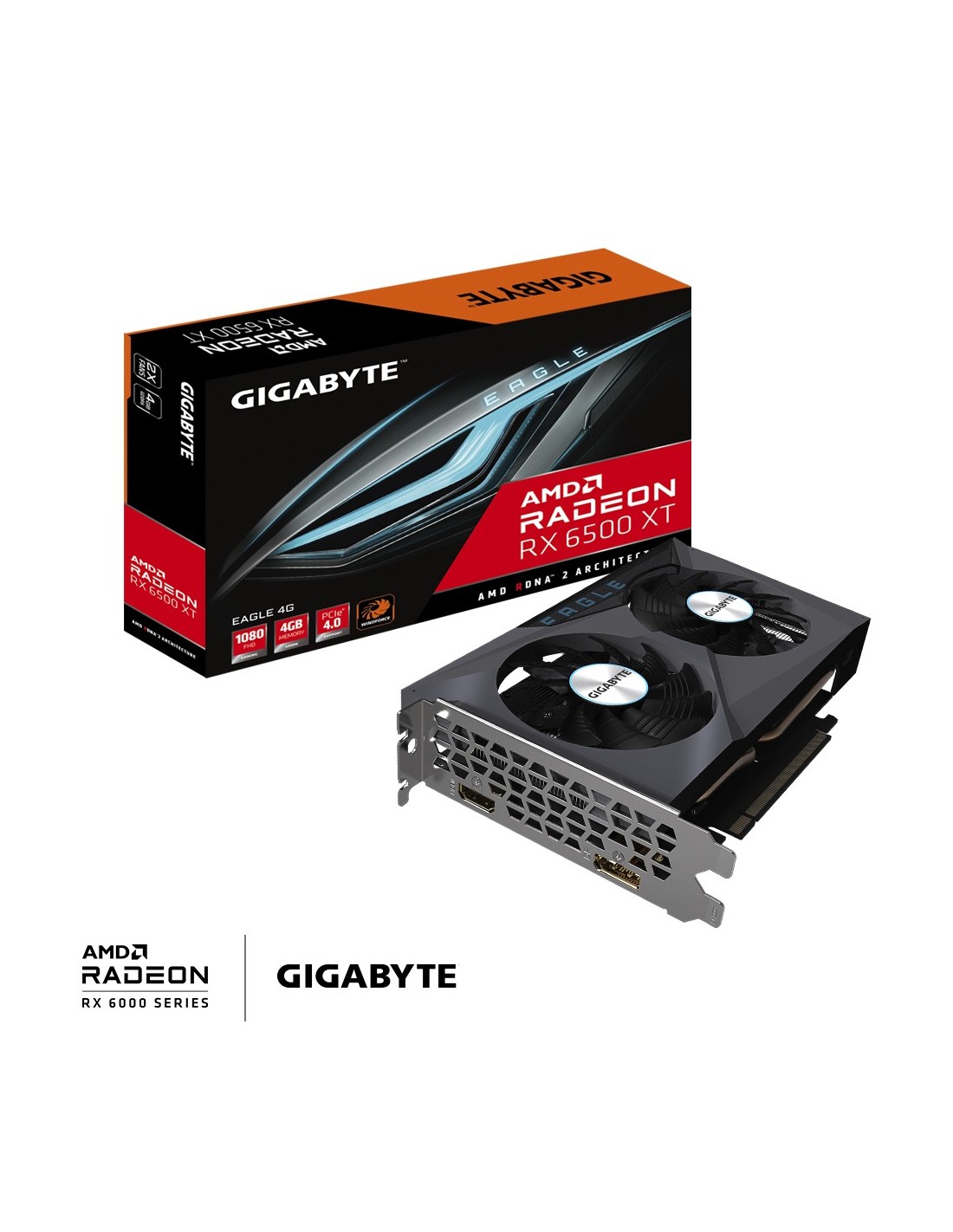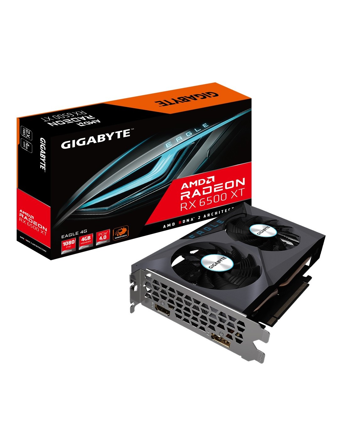 GIGABYTE EAGLE Radeon RX 6500 XT 4G. Familia de procesadores de gráficos: AMD, Procesador gráfico: Radeon RX 6500 XT. Capacidad memoria de adaptador gráfico: 4 GB, Tipo de memoria de adaptador gráfico: GDDR6, Ancho de datos: 64 bit, Velocidad de memoria del reloj: 18000 MHz. Máxima resolución: 7680 x 4320 Pixeles. Versión DirectX: 12 Ultimate, Versión OpenGL: 4.6. Tipo de interfaz: PCI Express 4.0. Tipo de enfriamiento: Activo, Número de ventiladores: 2 Ventilador(es)