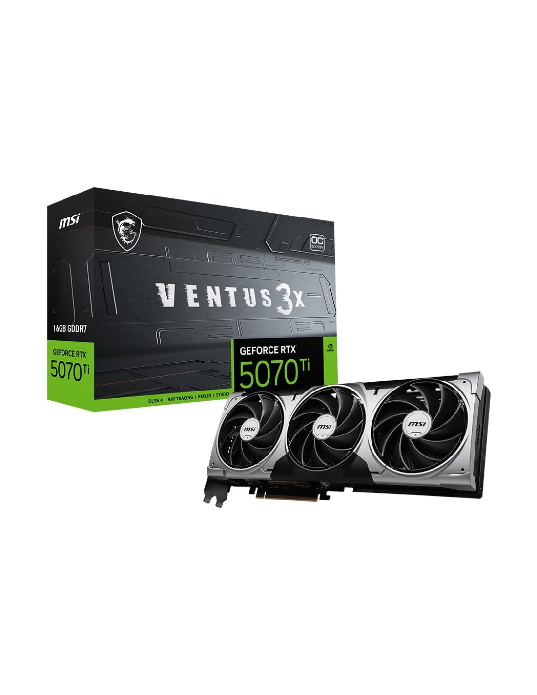 MSI GeForce RTX 5070 Ti 16G VENTUS 3X OC. Familia de procesadores de gráficos: NVIDIA, Procesador gráfico: GeForce RTX 5070 Ti, Frecuencia del procesador: 2497 MHz. Capacidad memoria de adaptador gráfico: 16 GB, Tipo de memoria de adaptador gráfico: GDDR7, Ancho de datos: 256 bit. Máxima resolución: 7680 x 4320 Pixeles. Versión DirectX: 12 Ultimate, Versión OpenGL: 4.6. Tipo de interfaz: PCI Express 5.0. Tipo de enfriamiento: Activo, Número de ventiladores: 3 Ventilador(es)