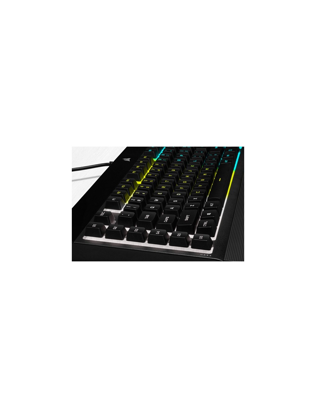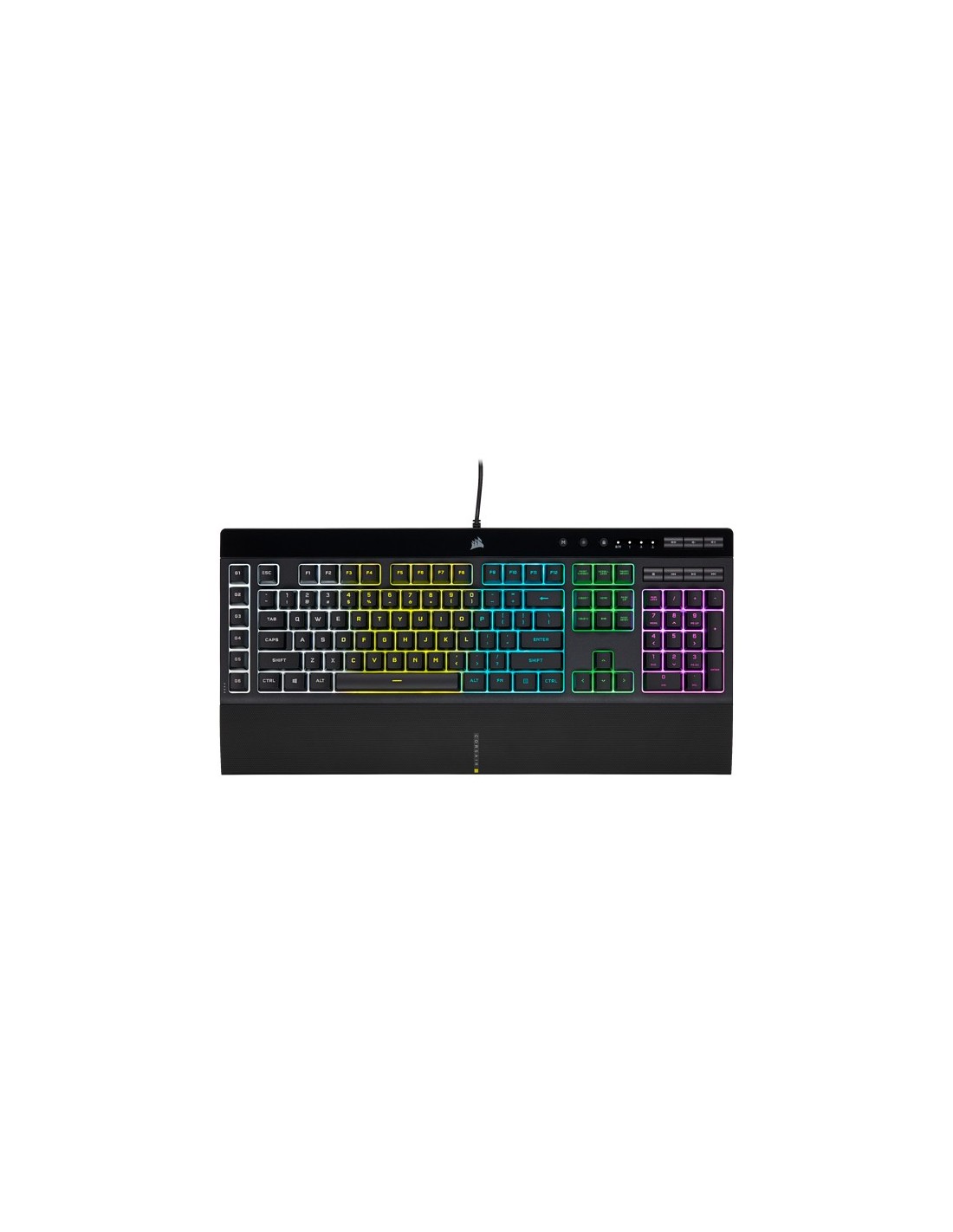 Corsair K55 RGB PRO. Formato del teclado: Completo (100%). Estilo de teclado: Derecho. Tecnología de conectividad: Alámbrico, Interfaz del dispositivo: USB, Diseño de teclado: QWERTY. Tipo de retroiluminación: LED RGB, Descansa muñecas. Uso recomendado: Juego. Color del producto: Negro