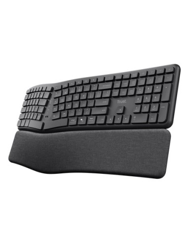 Trust Keyra Teclado inalámbrico multidispositivo ergonómico. Formato del teclado: Completo (100%). Estilo de teclado: Curvo. Tecnología de conectividad: Inalámbrico, Interfaz del dispositivo: RF Wireless + Bluetooth, Interruptor del teclado: Interruptor de membrana, Diseño de teclado: QWERTY, Teclado, cantidad de teclas: 111. Descansa muñecas. Uso recomendado: Hogar / Oficina. Color del producto: Negro