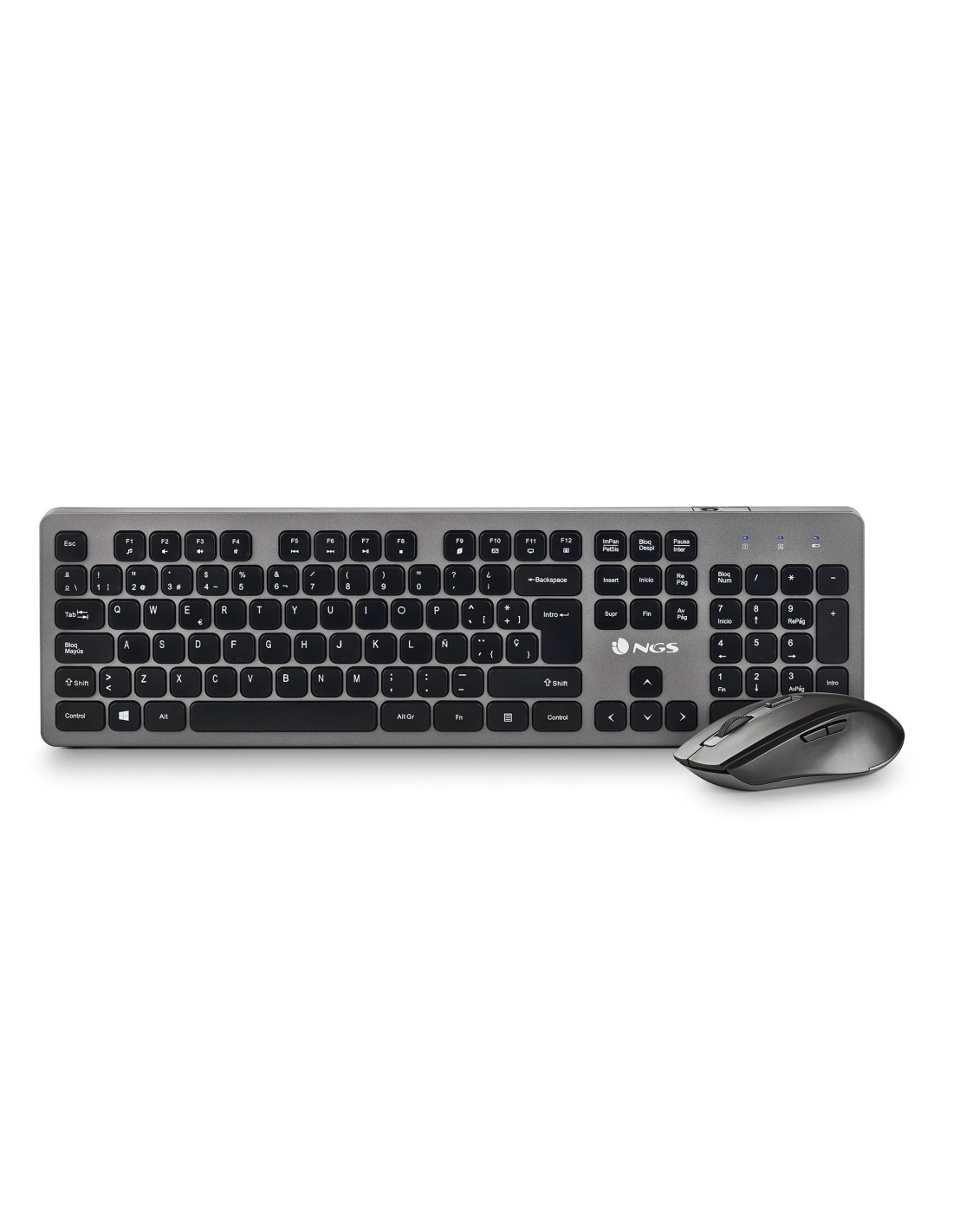 NGS IDOL KIT. Formato del teclado: Completo (100%). Estilo de teclado: Derecho. Tecnología de conectividad: Inalámbrico, Interfaz del dispositivo: RF inalámbrico, Diseño de teclado: QWERTY, Uso recomendado: Oficina. Color del producto: Negro, Plata. Ratón incluido