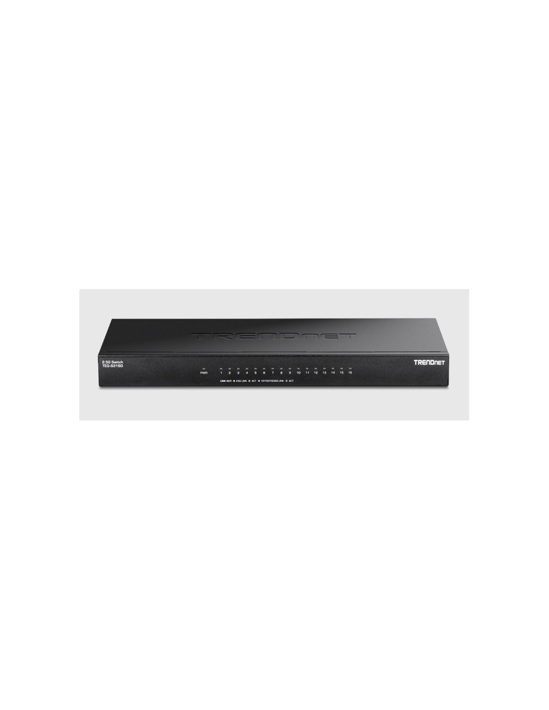 Trendnet TEG-S3160. Tipo de interruptor: No administrado. Puertos tipo básico de conmutación RJ-45 Ethernet: 2.5G Ethernet (100/1000/2500), Cantidad de puertos básicos de conmutación RJ-45 Ethernet: 16. Bidireccional completo (Full duplex). Tabla de direcciones MAC: 16000 entradas, Capacidad de conmutación: 80 Gbit/s. Estándares de red: IEEE 802.3, IEEE 802.3ab, IEEE 802.3az, IEEE 802.3bz, IEEE 802.3u, IEEE 802.3x, IEEE 802.3z. Montaje de pared, Montaje en rack, Factor de forma: Escritorio