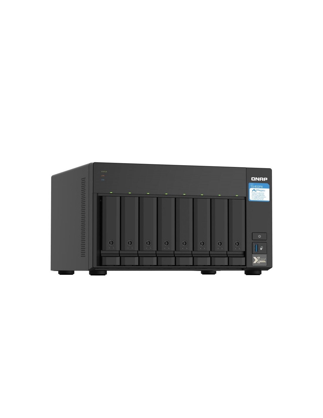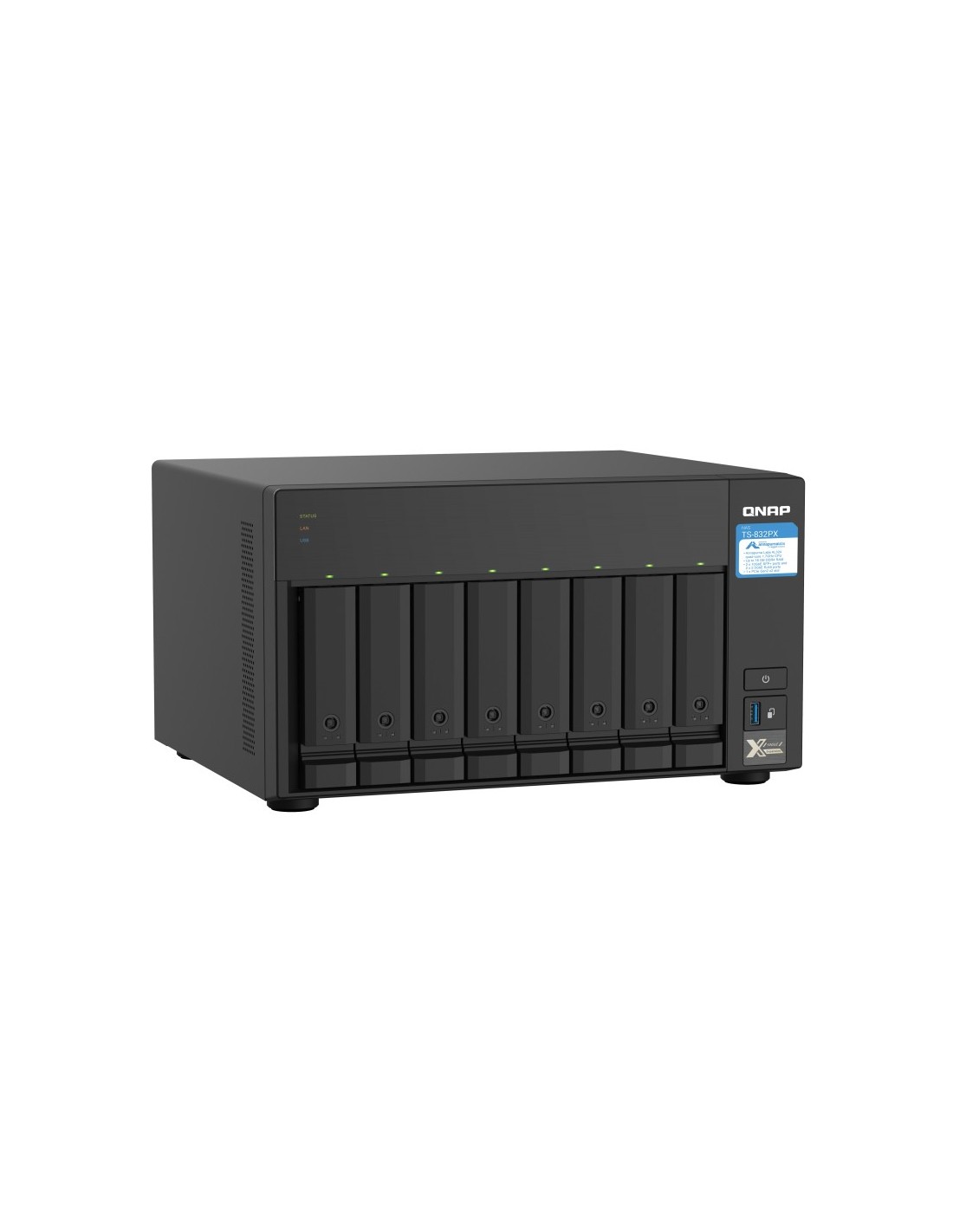 QNAP TS-832PX. Tipos de unidades de almacenamiento admitidas: HDD & SSD, Interfaz de unidad de almacenamiento: Serial ATA III, Interfaces de disco de almacenamiento soportados: Serial ATA II, Serial ATA III. Familia de procesador: Annapurna Labs, Fabricante de procesador: Annapurna Labs, Modelo del procesador: AL324. Memoria interna: 4 GB, Tipo de memoria interna: DDR4, Velocidad de memoria del reloj: 2400 MHz. Ethernet LAN, velocidad de transferencia de datos: 100,1000,2500,10000 Mbit/s. Conector fibra óptica: SFP+