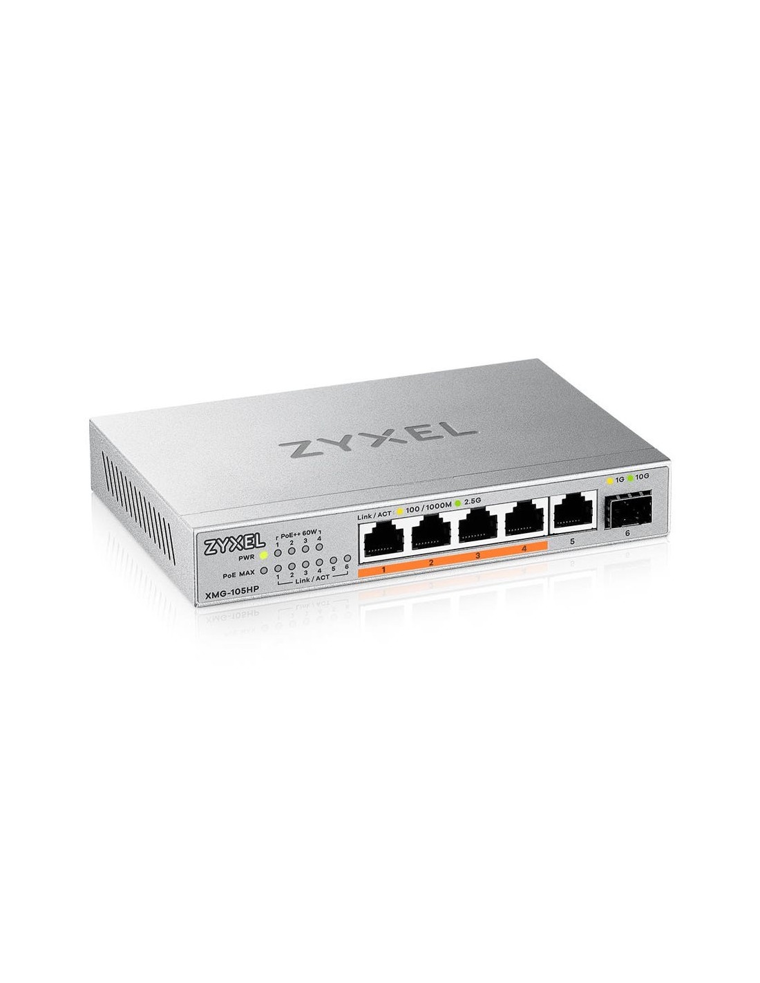 Zyxel XMG-105HP. Tipo de interruptor: No administrado. Puertos tipo básico de conmutación RJ-45 Ethernet: 2.5G Ethernet (100/1000/2500), Cantidad de puertos básicos de conmutación RJ-45 Ethernet: 5. Tabla de direcciones MAC: 4000 entradas, Capacidad de conmutación: 45 Gbit/s. Energía sobre Ethernet (PoE)