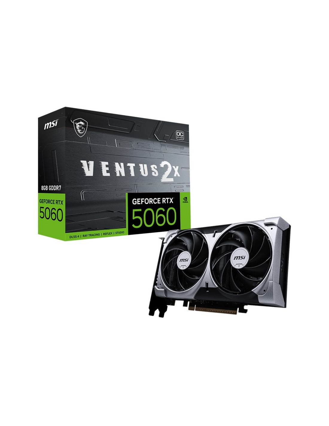 MSI GeForce RTX 5060 8G VENTUS 2X OC. Familia de procesadores de gráficos: NVIDIA, Procesador gráfico: GeForce RTX 5060. Capacidad memoria de adaptador gráfico: 8 GB, Tipo de memoria de adaptador gráfico: GDDR7, Ancho de datos: 128 bit. Máxima resolución: 7680 x 4320 Pixeles. Versión DirectX: 12 Ultimate, Versión OpenGL: 4.6. Tipo de interfaz: PCI Express x16 5.0. Tipo de enfriamiento: Activo, Número de ventiladores: 2 Ventilador(es)