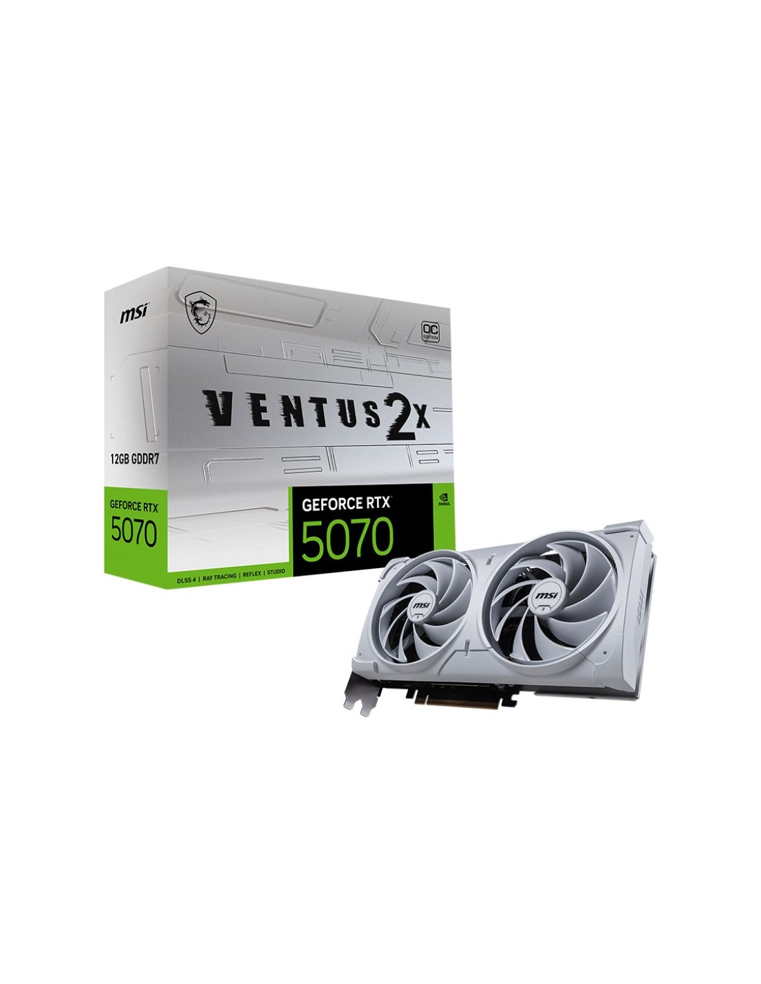 MSI GeForce RTX5070 VENTUS 2X OC White. Familia de procesadores de gráficos: NVIDIA, Procesador gráfico: GeForce RTX 5070. Capacidad memoria de adaptador gráfico: 12 GB, Tipo de memoria de adaptador gráfico: GDDR7, Ancho de datos: 192 bit. Máxima resolución: 7680 x 4320 Pixeles. Versión DirectX: 12 Ultimate, Versión OpenGL: 4.6. Tipo de interfaz: PCI Express 5.0. Tipo de enfriamiento: Activo, Número de ventiladores: 2 Ventilador(es)