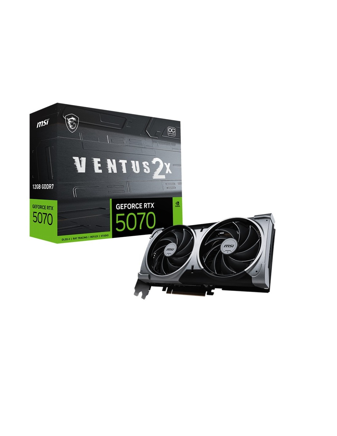 MSI GeForce RTX 5070 12G VENTUS 2X OC. Familia de procesadores de gráficos: NVIDIA, Procesador gráfico: GeForce RTX 5070. Capacidad memoria de adaptador gráfico: 12 GB, Tipo de memoria de adaptador gráfico: GDDR7, Ancho de datos: 192 bit. Máxima resolución: 7680 x 4320 Pixeles. Versión DirectX: 12 Ultimate, Versión OpenGL: 4.6. Tipo de interfaz: PCI Express 5.0. Tipo de enfriamiento: Activo, Número de ventiladores: 2 Ventilador(es)