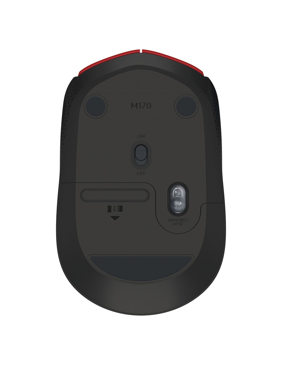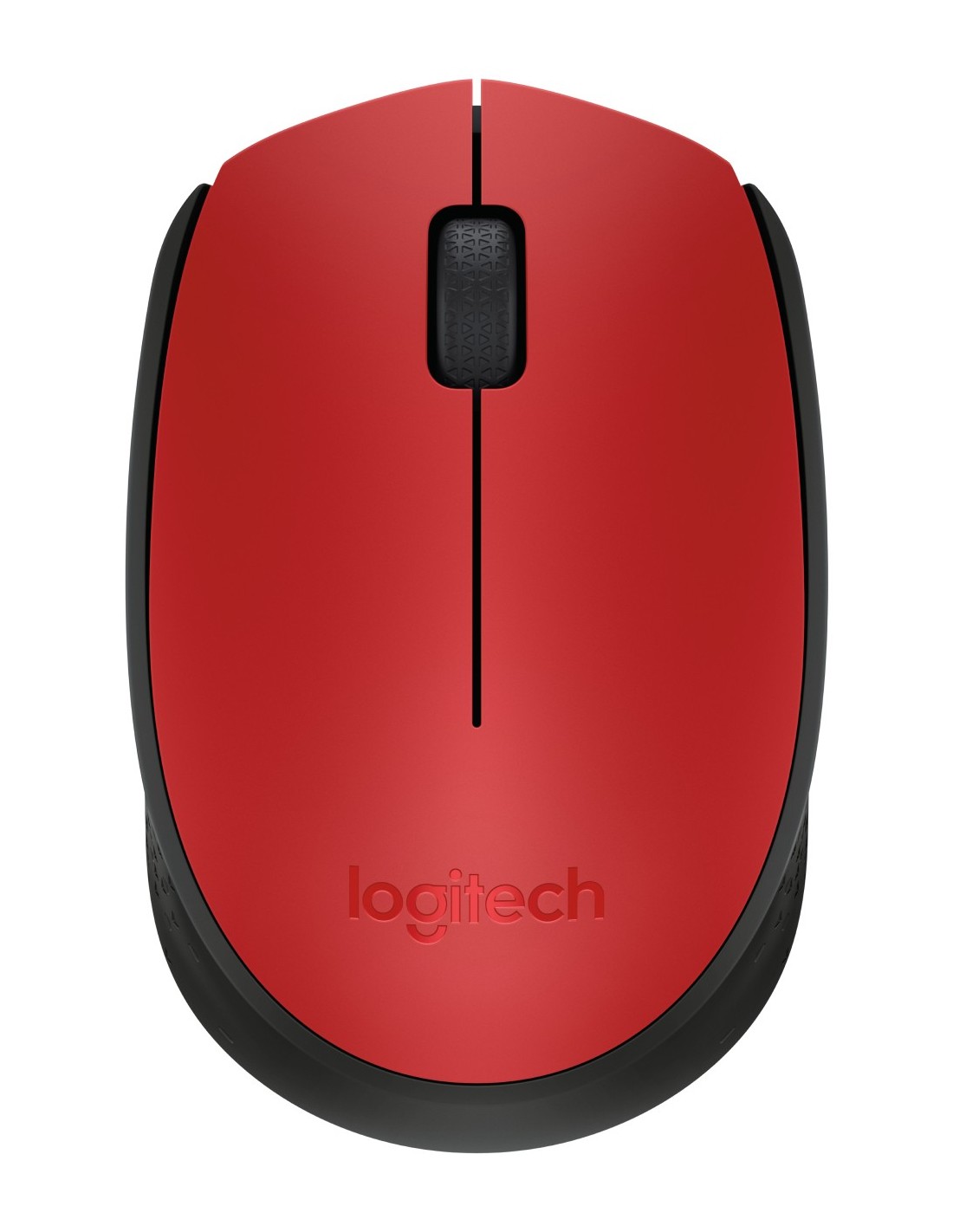 Logitech M171. Factor de forma: Ambidextro. Tecnología de detección de movimientos: Óptico, Interfaz del dispositivo: RF inalámbrico, Resolución de movimiento: 1000 DPI, Tipo de botones: Botones presionados, Cantidad de botones: 2, Tipo de desplazamiento: Rueda. Fuente de energía: Baterías. Color del producto: Negro, Rojo