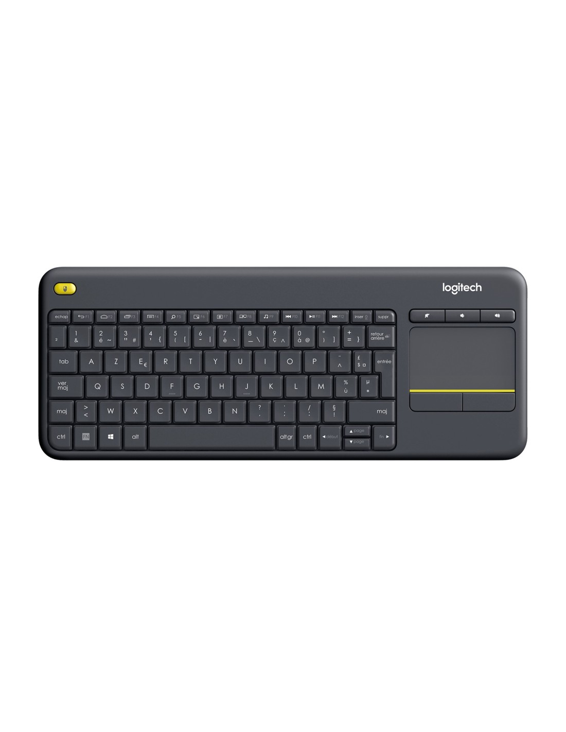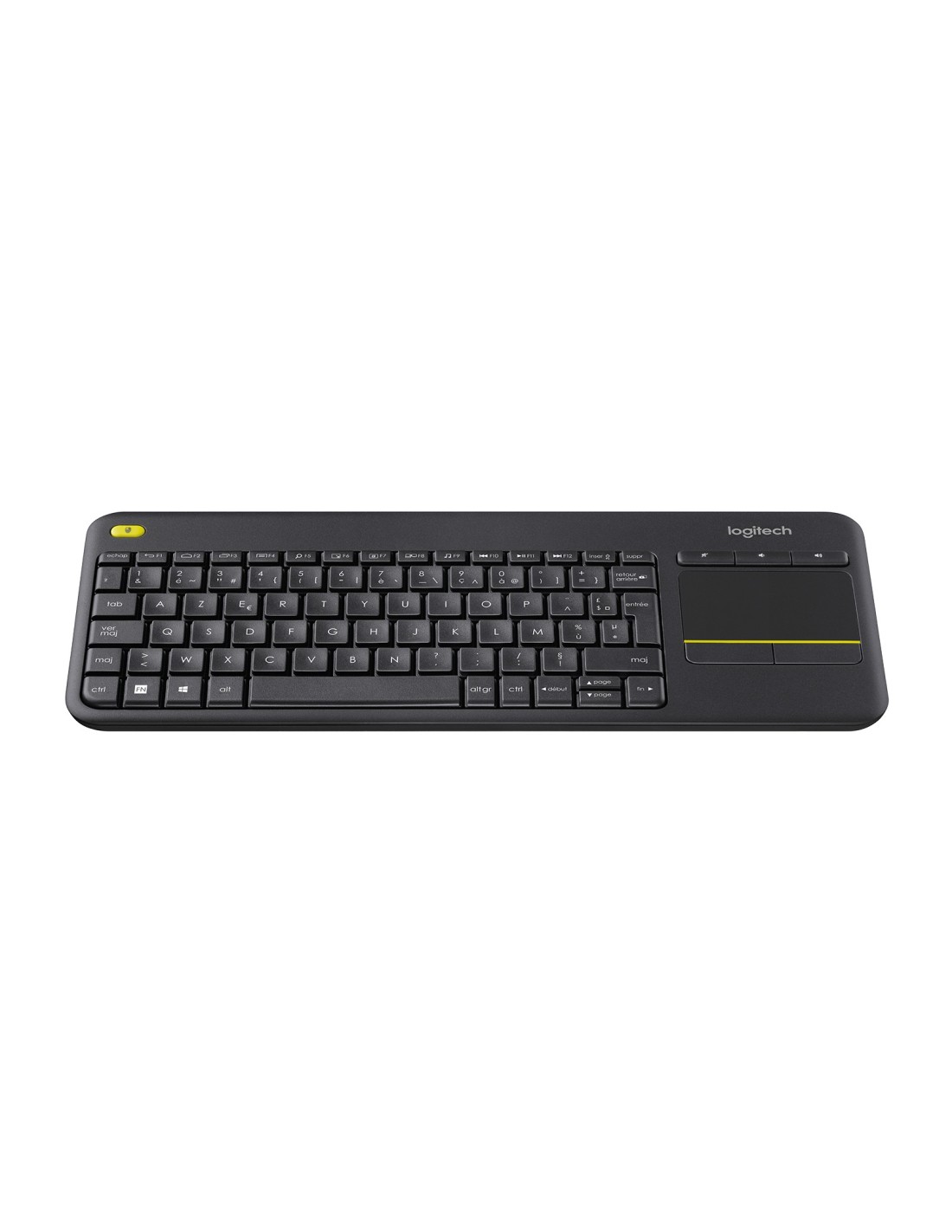 Logitech K400 Plus. Formato del teclado: Completo (100%). Estilo de teclado: Derecho. Tecnología de conectividad: Inalámbrico, Interfaz del dispositivo: RF inalámbrico, Diseño de teclado: AZERTY, Uso recomendado: Universal. Color del producto: Negro